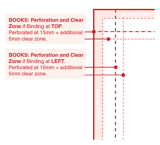 Pads require a 6mm clear zone on each margin. Books require an additional clear zone to allow for perforation - see perforation positions in the next section down. The design templates have guidelines present for both pads and books and these are set up to be the correct size.