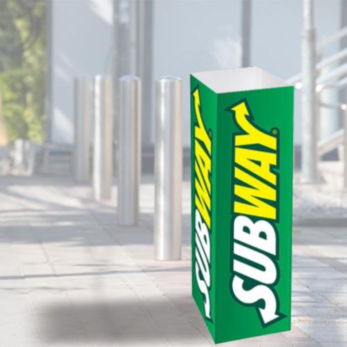 These neat sleeves wrap around a lamp post or bollard. Great for outdoor event signage or car park navigation. Printed on waterproof corrugated, fluted board.