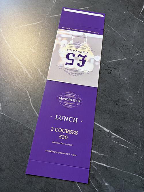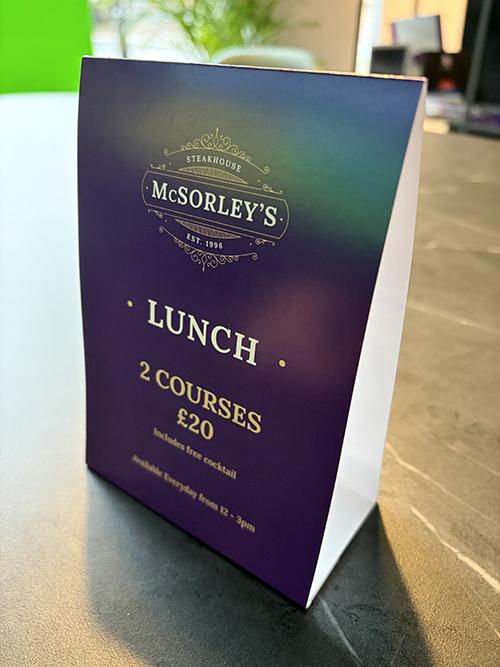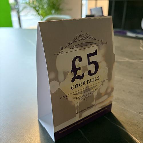 Available in 3 sizes - small (A6), Medium, (1/3rd A4) and Tall (297 x 140mm), all with 3 panels to personalise with your promotion or menu.